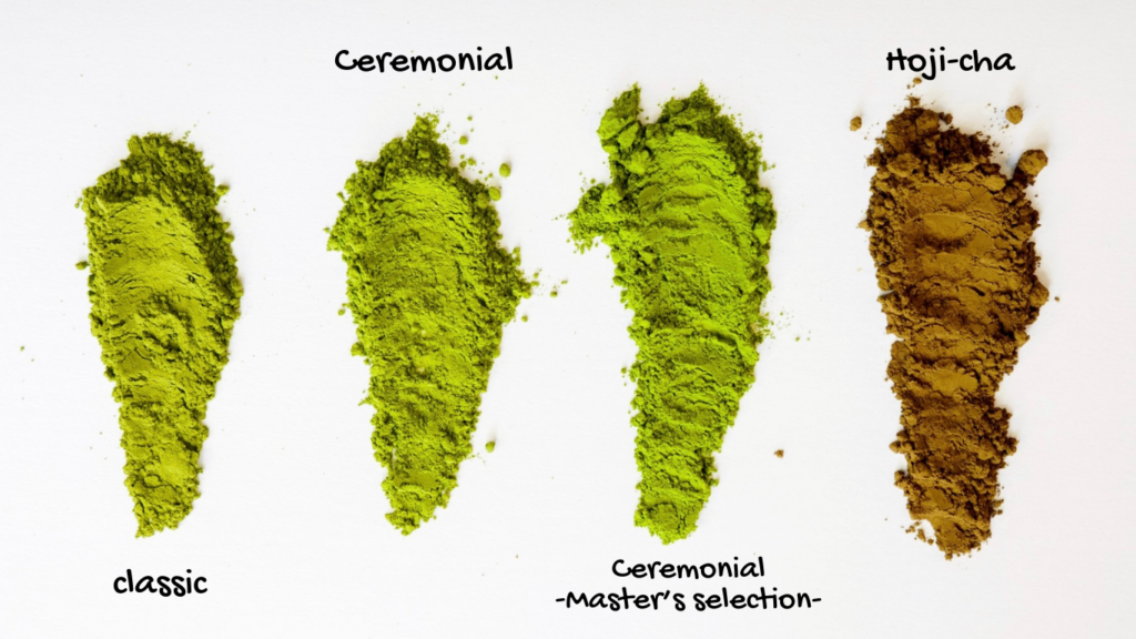 We will send you four types of samples: three matcha grades — Classic, Ceremonial, and Ceremonial~Master’s Selection — and Hoji-cha powder.